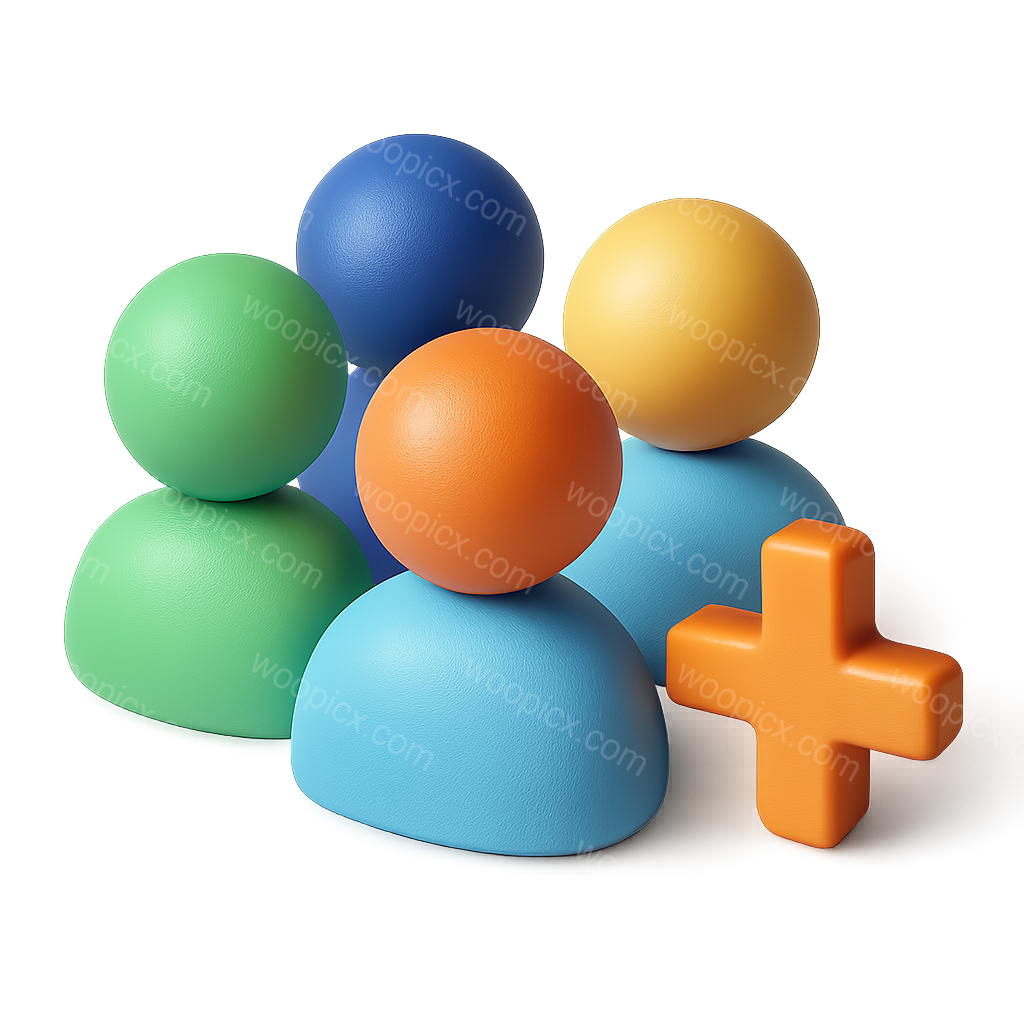 A vibrant 3D representation of multiple user profiles, featuring colorful, rounded shapes. The design includes a plus icon, symbolizing addition or new users, set against a soft gradient background.