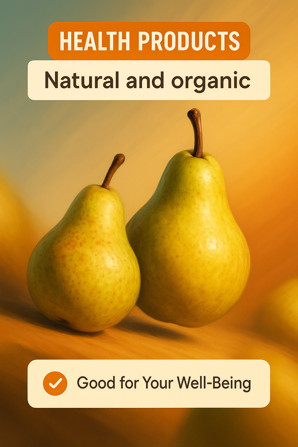 This image is a vibrant graphic showcasing two pears, representing natural and organic health products. It is ideal for marketing or informational purposes.