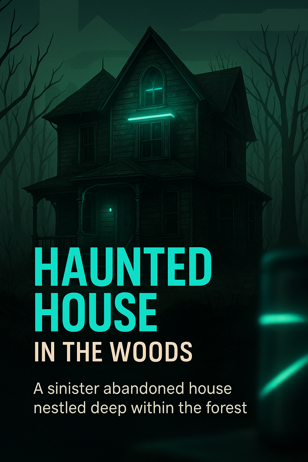 A mysterious and atmospheric digital illustration depicting a haunted house surrounded by a dark forest, perfect for horror-themed projects and promotions.
