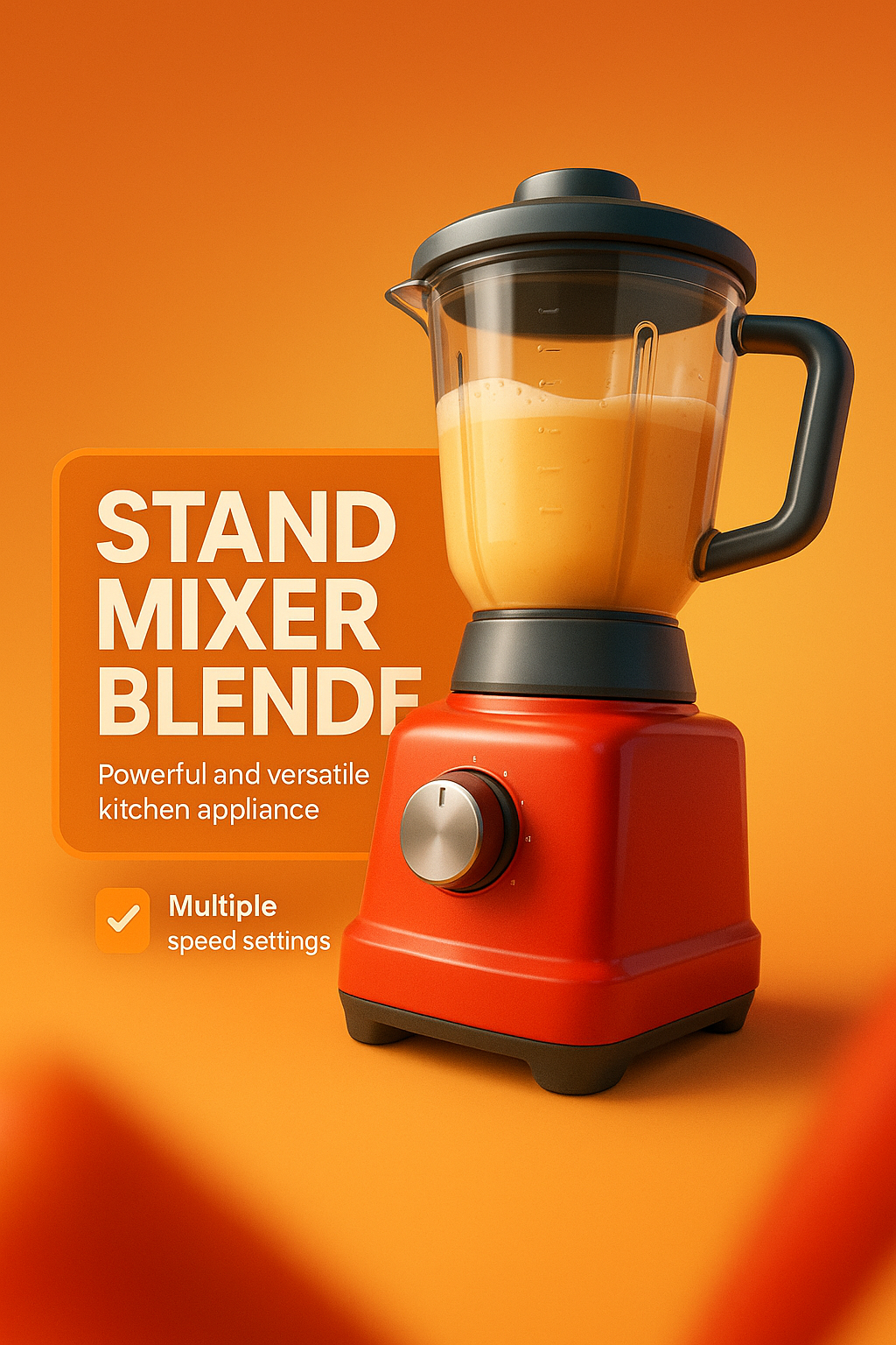 A 3D render of a stand mixer blender against an orange backdrop, highlighting its design and features. Ideal for kitchen appliance marketing.