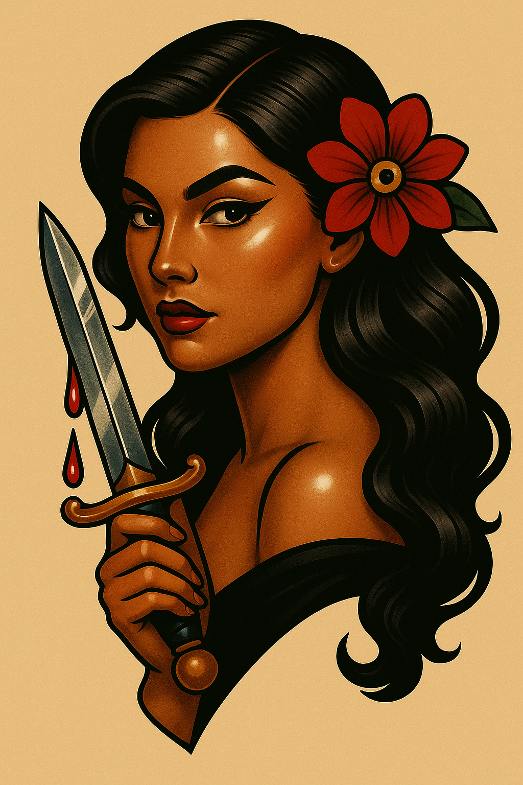 /Collection: /by davooda/Type: PNG/A striking portrait of a woman holding a dagger, with blood dripping from the blade. She has long, dark hair adorned with a red flower, set against a light beige background. The artwork features a glossy, anime-inspired style reminiscent of classic tattoo art.