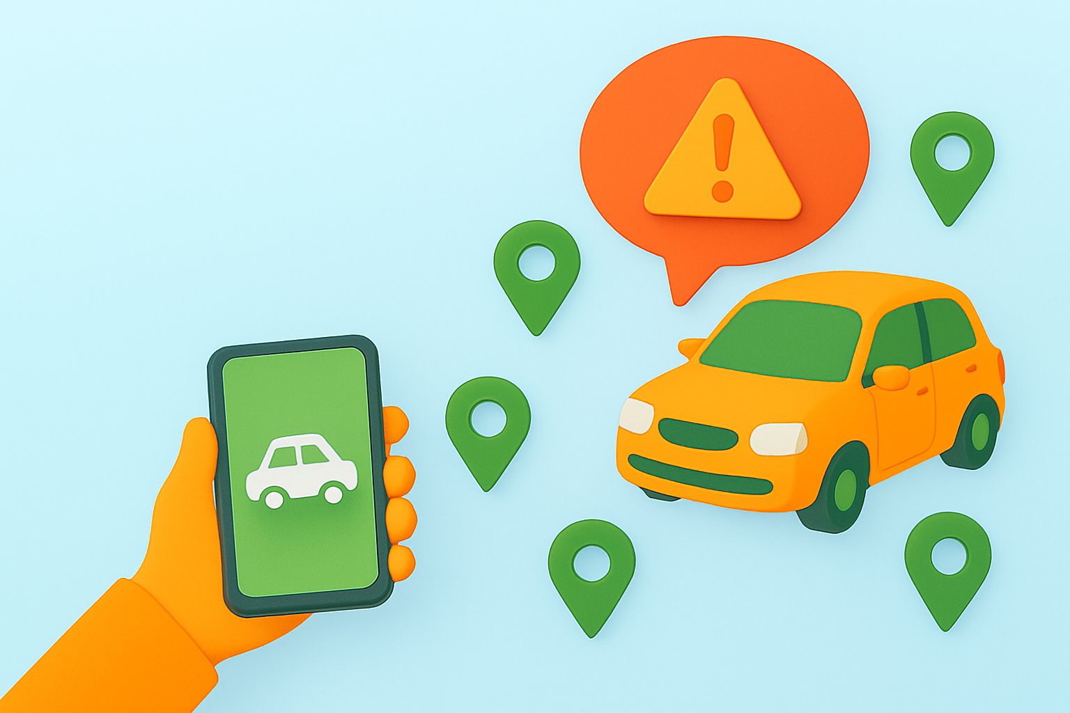 /Collection: /by Sergey Leonov/Type: PNG/A vibrant 3D illustration depicting a hand holding a smartphone showing a car icon, alongside an orange alert symbol and location pins. Ideal for automotive apps or navigation services.