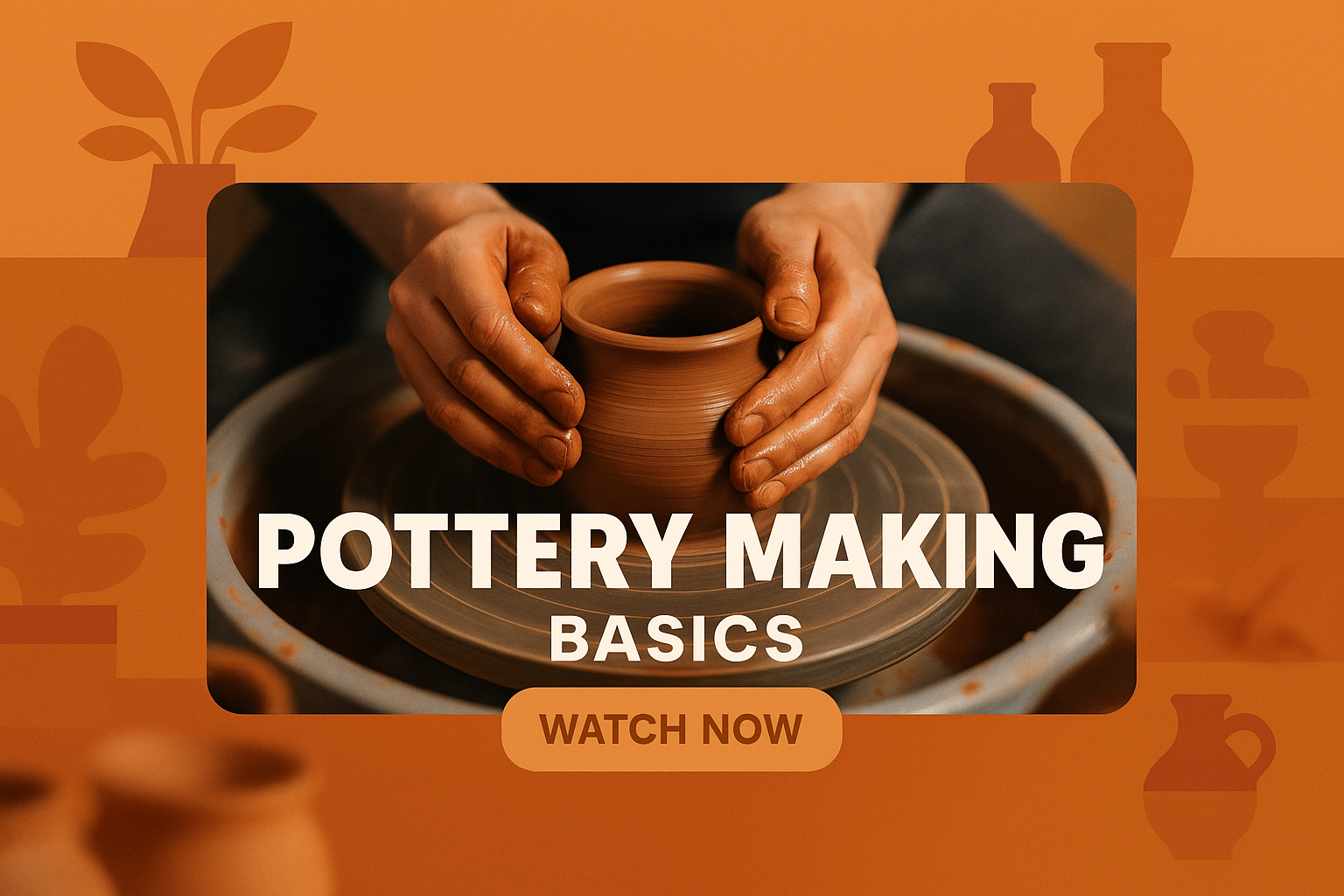 /Collection: /by davooda/Type: PNG/A vibrant promotional image for a pottery making tutorial, featuring hands shaping a clay pot against a warm orange background. Ideal for social media or video platforms.