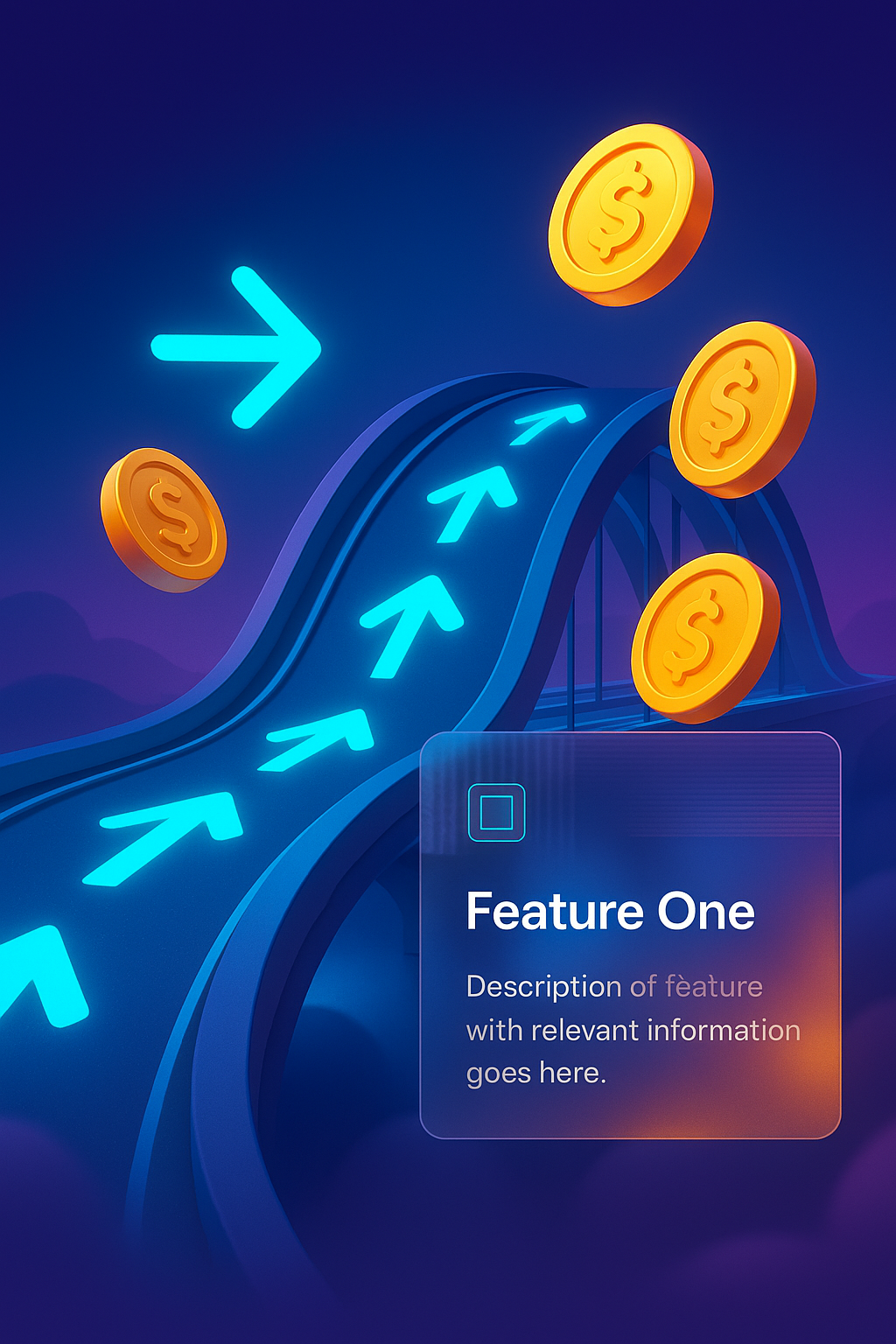 A vibrant 3D illustration of a futuristic bridge illuminated by glowing arrows and floating coins, featuring an integrated text block with a sleek design.