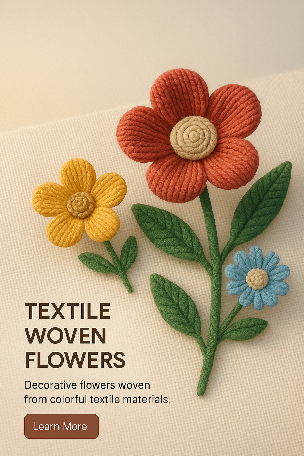A detailed 3D illustration of vibrant textile woven flowers in a zoomed-out view, featuring a smooth gradient background and a call-to-action button.