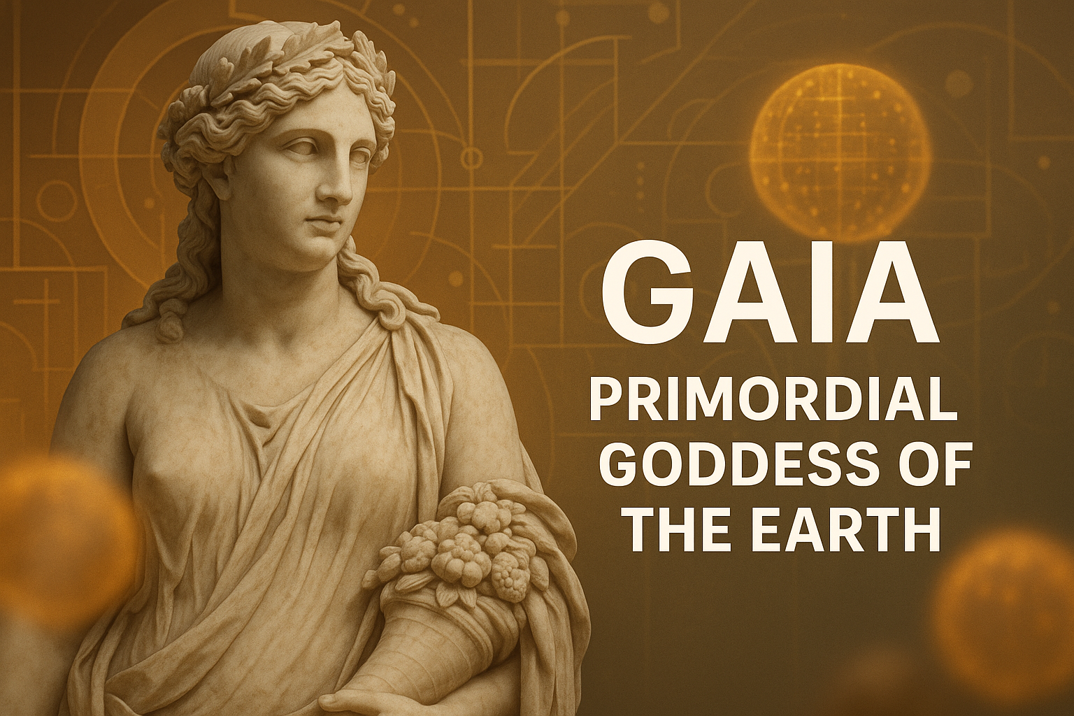 A visually striking depiction of Gaia, the primordial goddess, combining classical sculpture with modern graphic elements. Ideal for mythology-themed content.