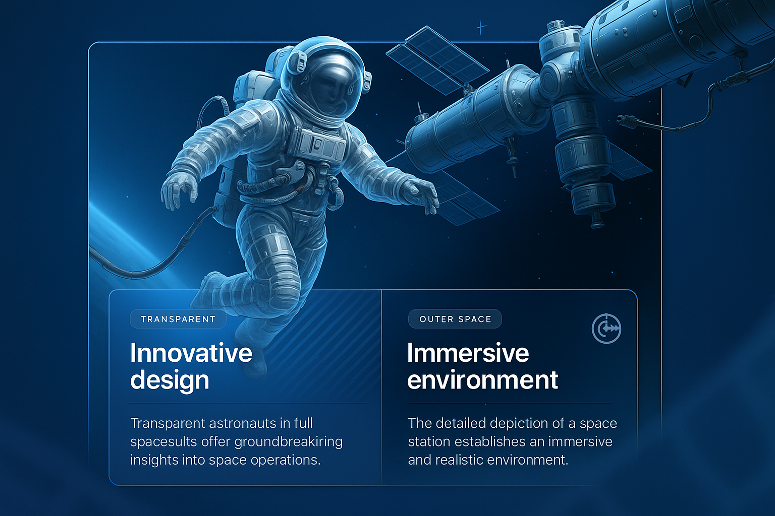 A dynamic 3D illustration featuring astronauts in spacesuits interacting with a space station in outer space. The design includes a smooth gradient background and layered elements for depth.