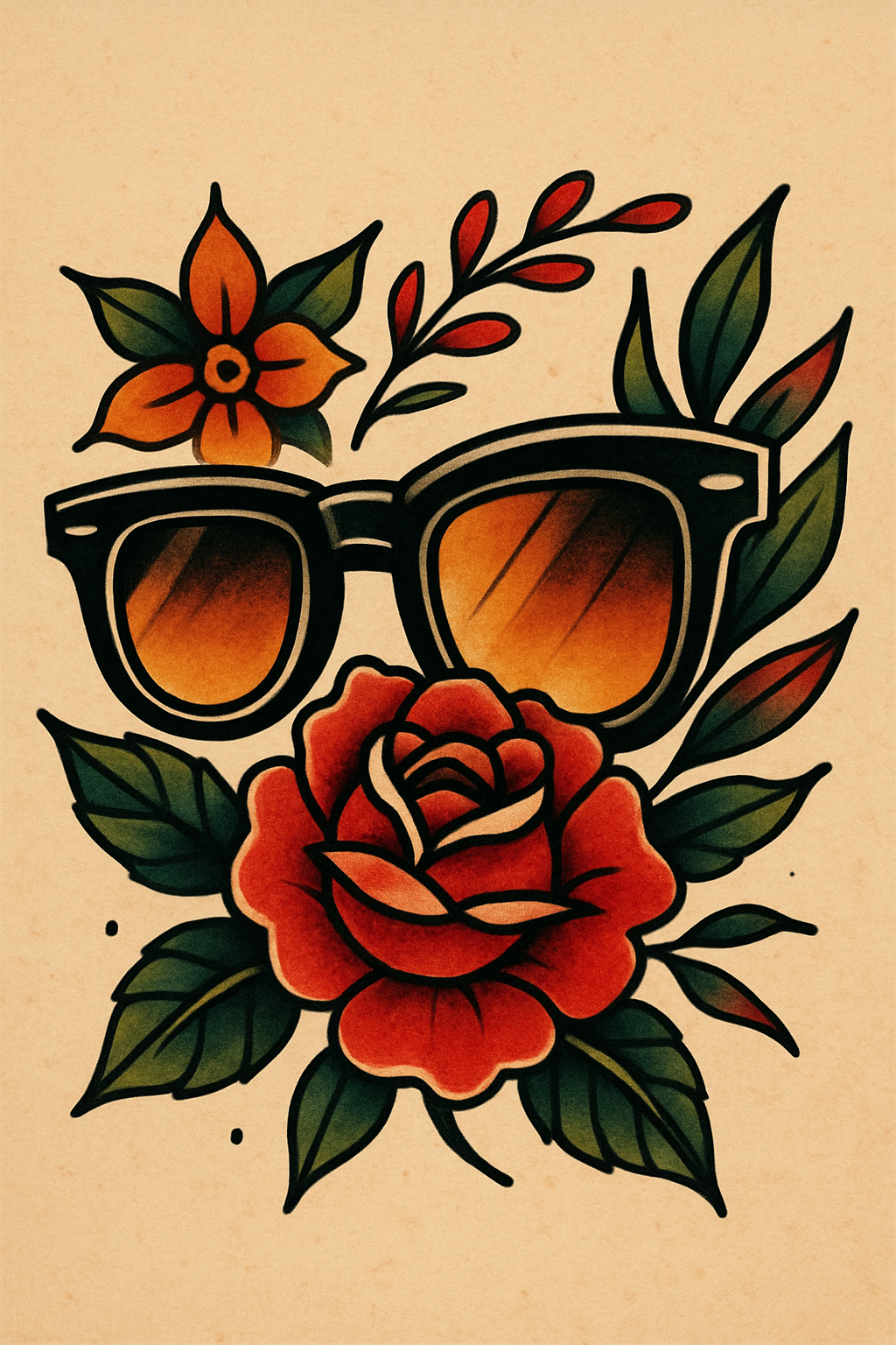 Vintage Tattoo Style Artwork Featuring Sunglasses and Roses