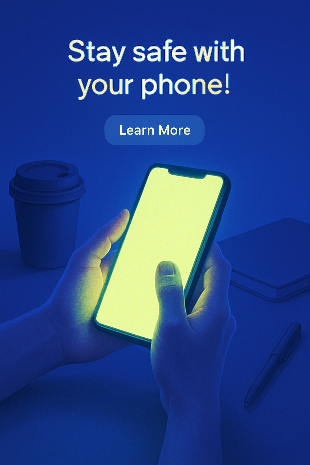 /Collection: /by davooda/Type: PNG/A pair of hands holds a glowing phone against a solid blue background. The phone emits a soft yellow-green glow, enhancing the surrounding atmosphere with cool shades. A call-to-action button encourages interaction.
