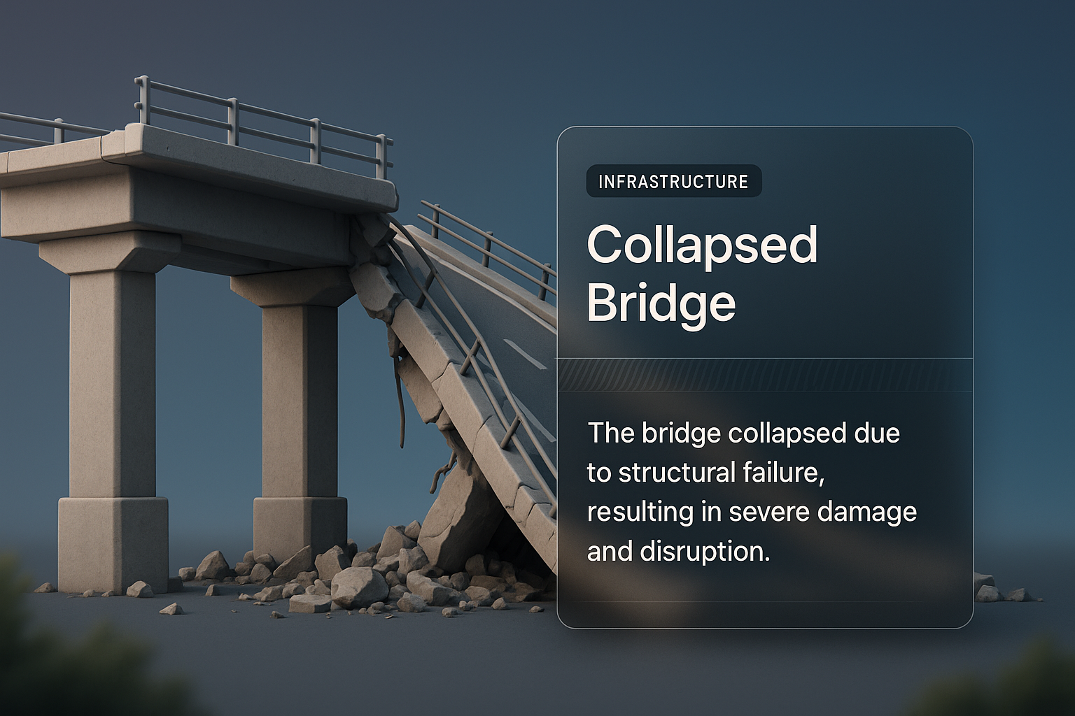 This image depicts a collapsed bridge with significant structural damage. The scene features a gradient background, enhancing the realism of the bridge's failure, emphasizing the impact on infrastructure.