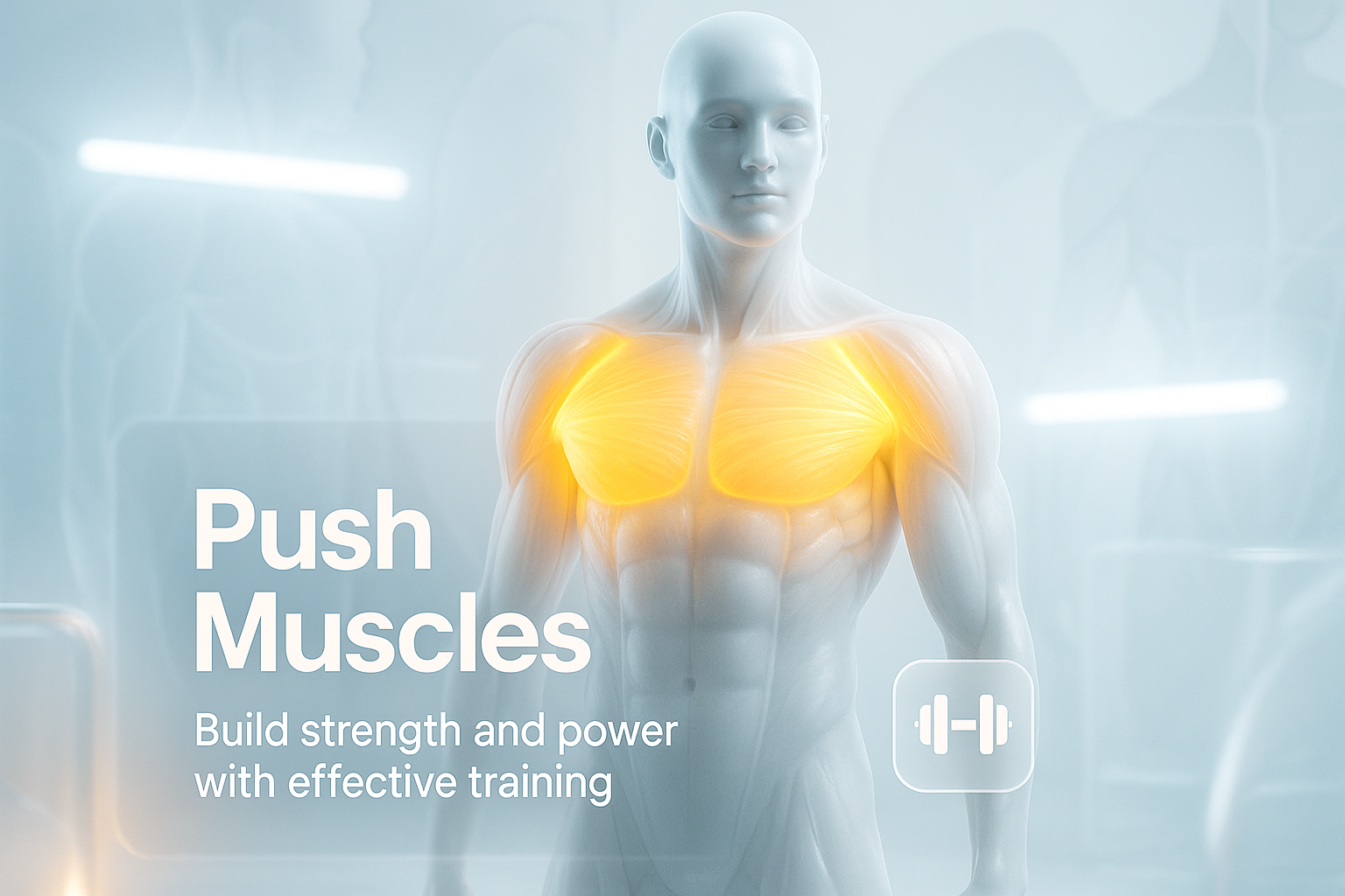 A modern illustration showcasing the push muscles with a focus on strength training. The design features a semi-transparent figure with glowing muscle highlights, appealing for fitness and health-related content.