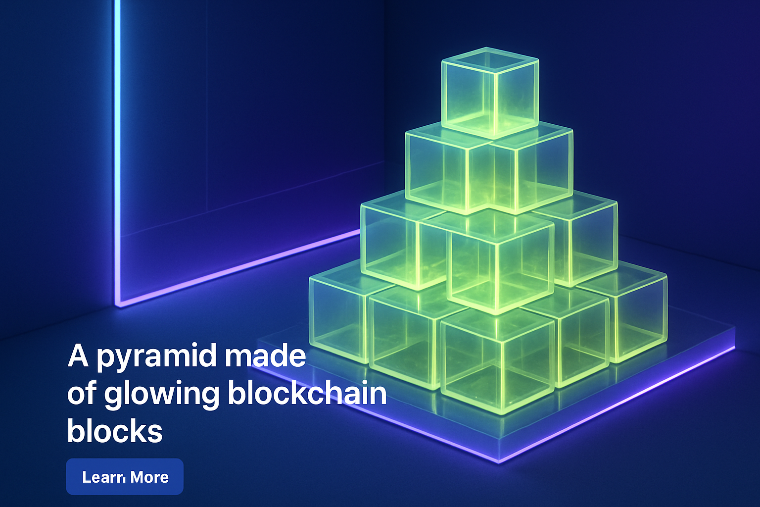 A visually striking pyramid made of semi-transparent glowing blocks representing blockchain technology, surrounded by a cool-toned atmospheric setting with neon accents.