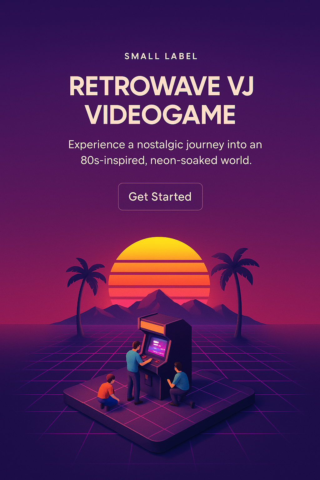 A vibrant retro-futuristic scene featuring a sunset with neon colors and palm trees. Small figures interact with a vintage arcade machine in a cyberpunk landscape, evoking nostalgia.