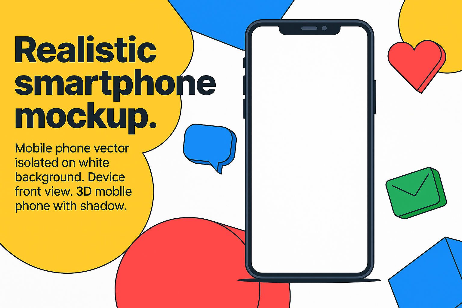 /Collection: /by davooda/Type: PNG/A realistic smartphone mockup displayed on a white background, featuring bold typography and vibrant geometric shapes. The device showcases a front view with a shadow effect, ideal for UI/UX presentations.