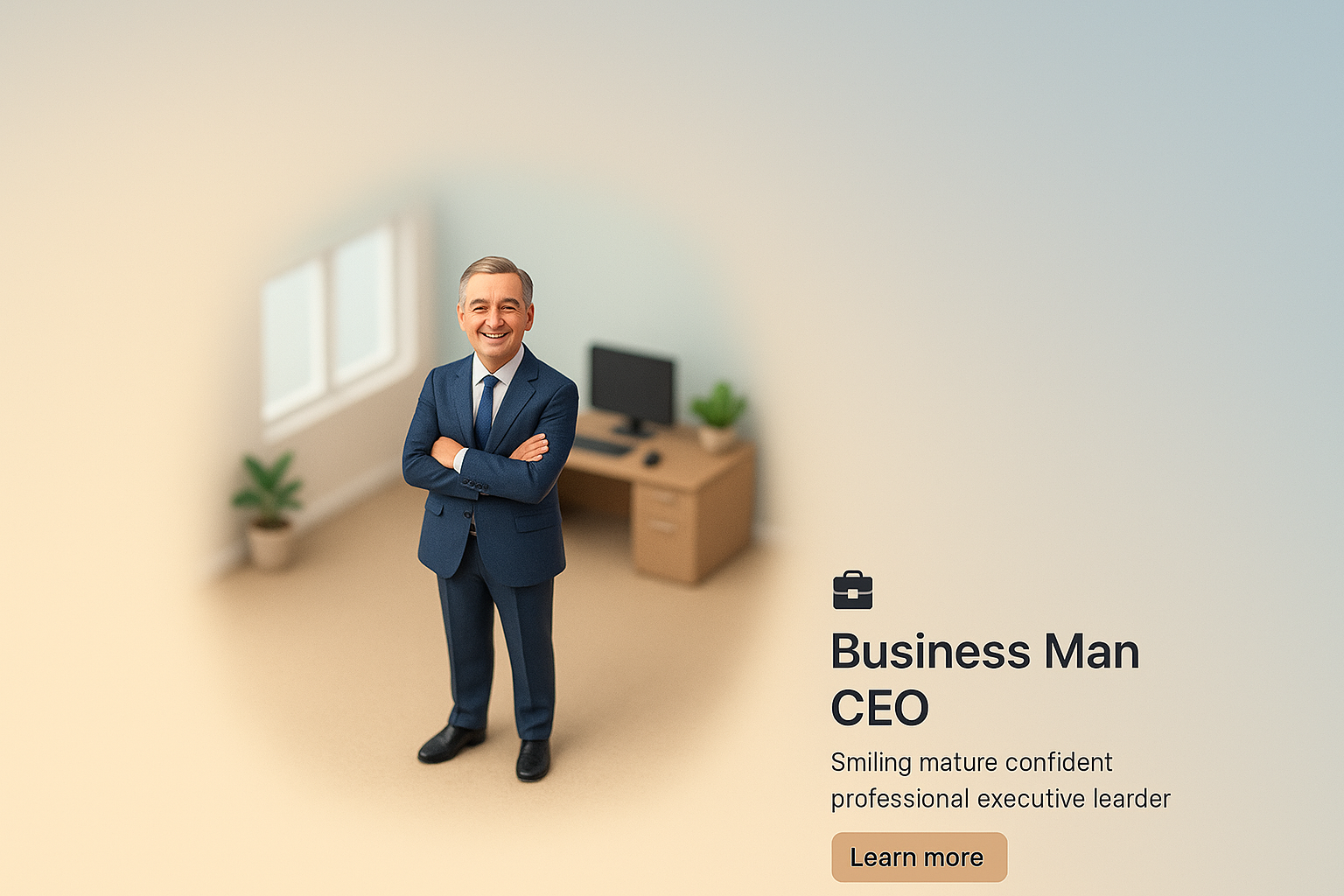 /Collection: /by davooda/Type: PNG/A happy middle-aged business man stands confidently in a modern office, arms crossed. He wears a blue suit, exuding professionalism and leadership in a well-designed 3D scene.