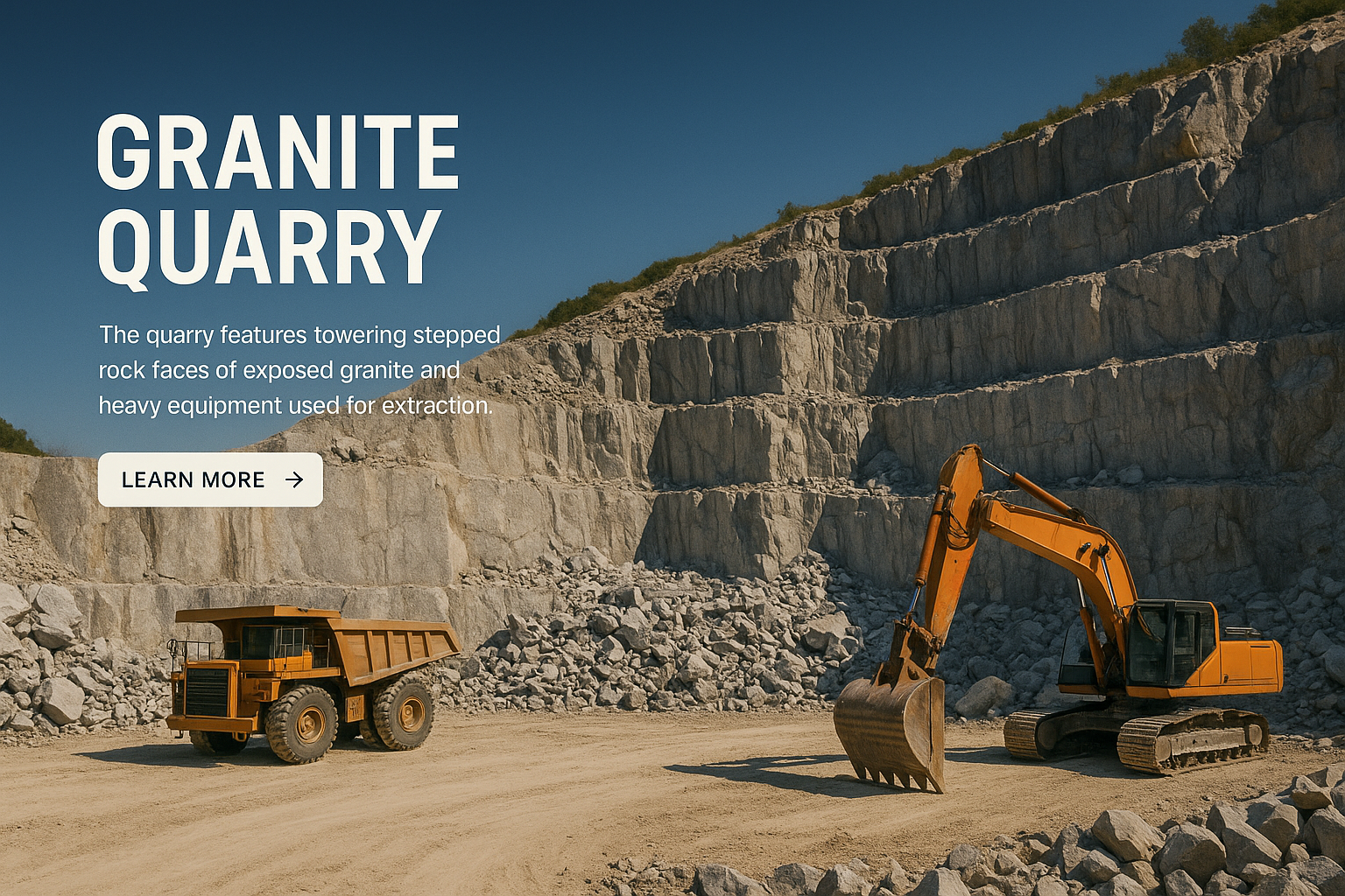 The image showcases a granite quarry featuring towering rock faces, heavy machinery like an excavator and a dump truck, highlighting the extraction process.