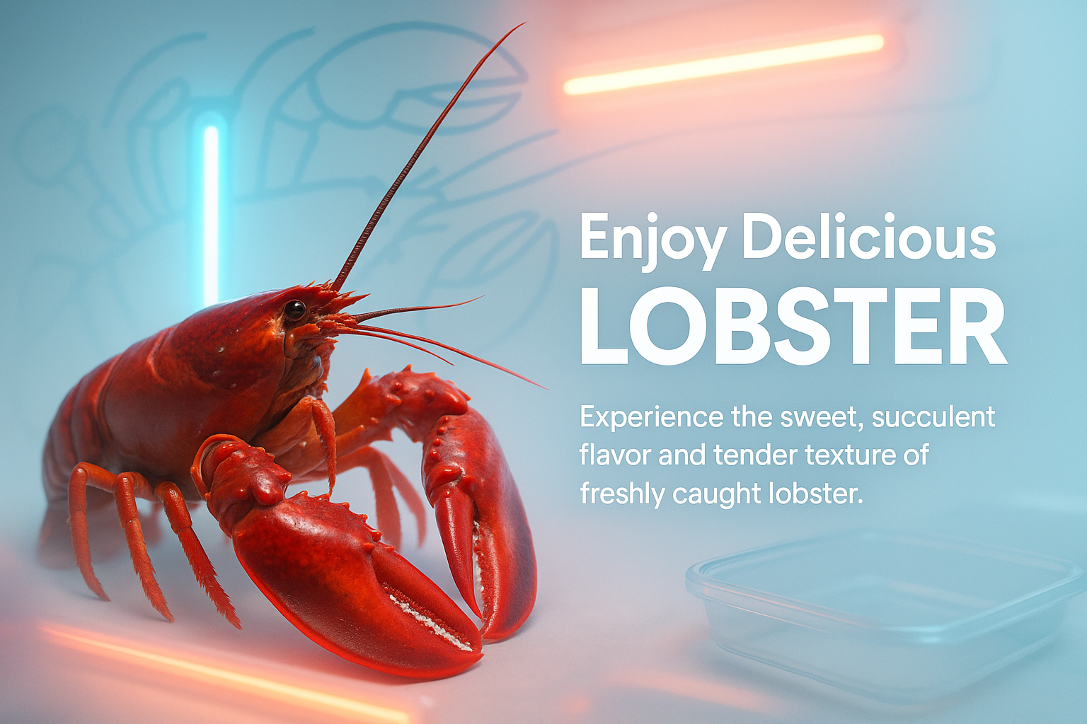 A visually appealing promotional image featuring a freshly caught lobster, designed to entice seafood lovers. The vibrant colors and modern design elements suggest a focus on culinary excellence.