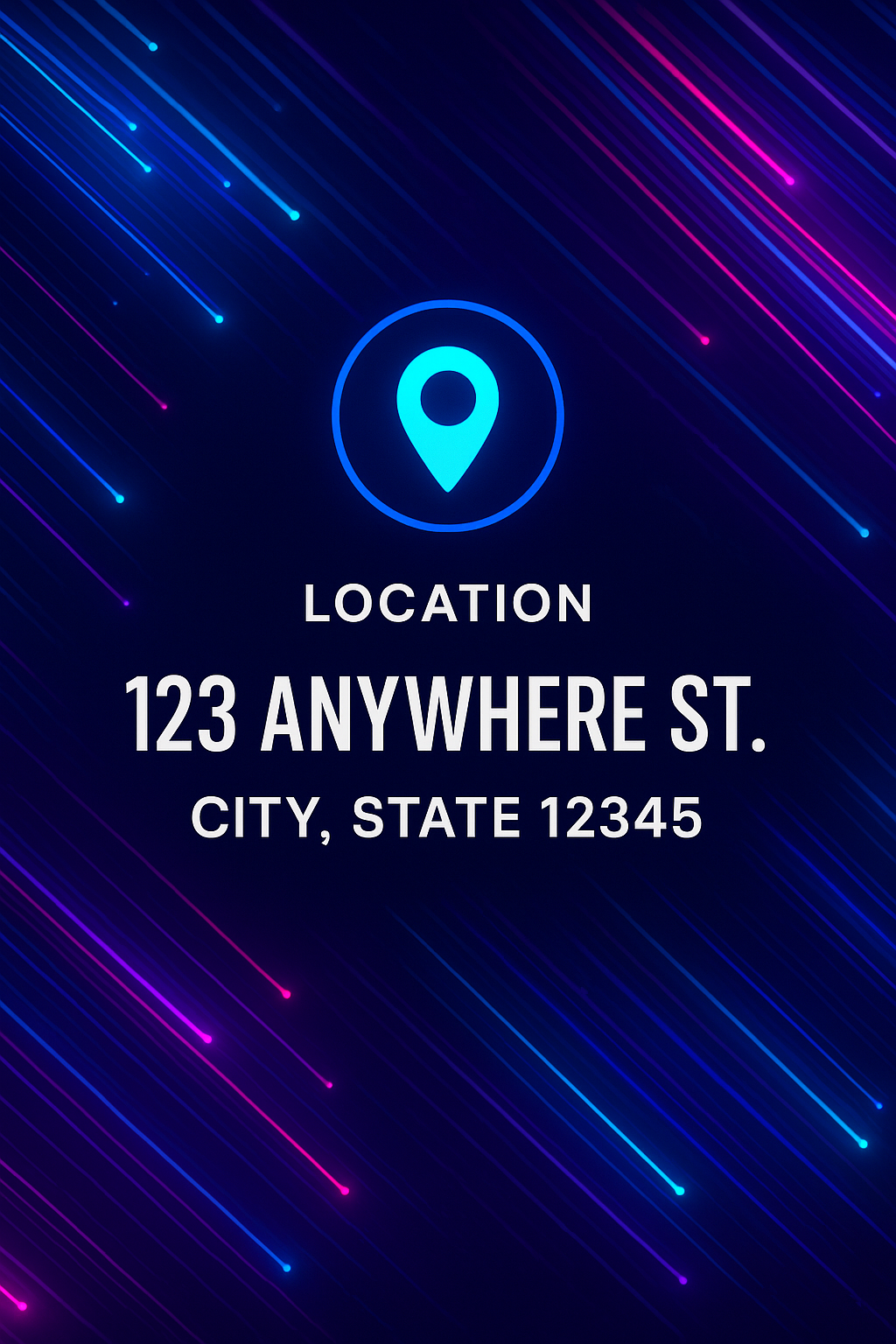/Collection: /by davooda/Type: PNG/Vibrant graphic featuring a location marker and address details set against a dynamic, colorful backdrop. Ideal for digital invitations or event promotions.