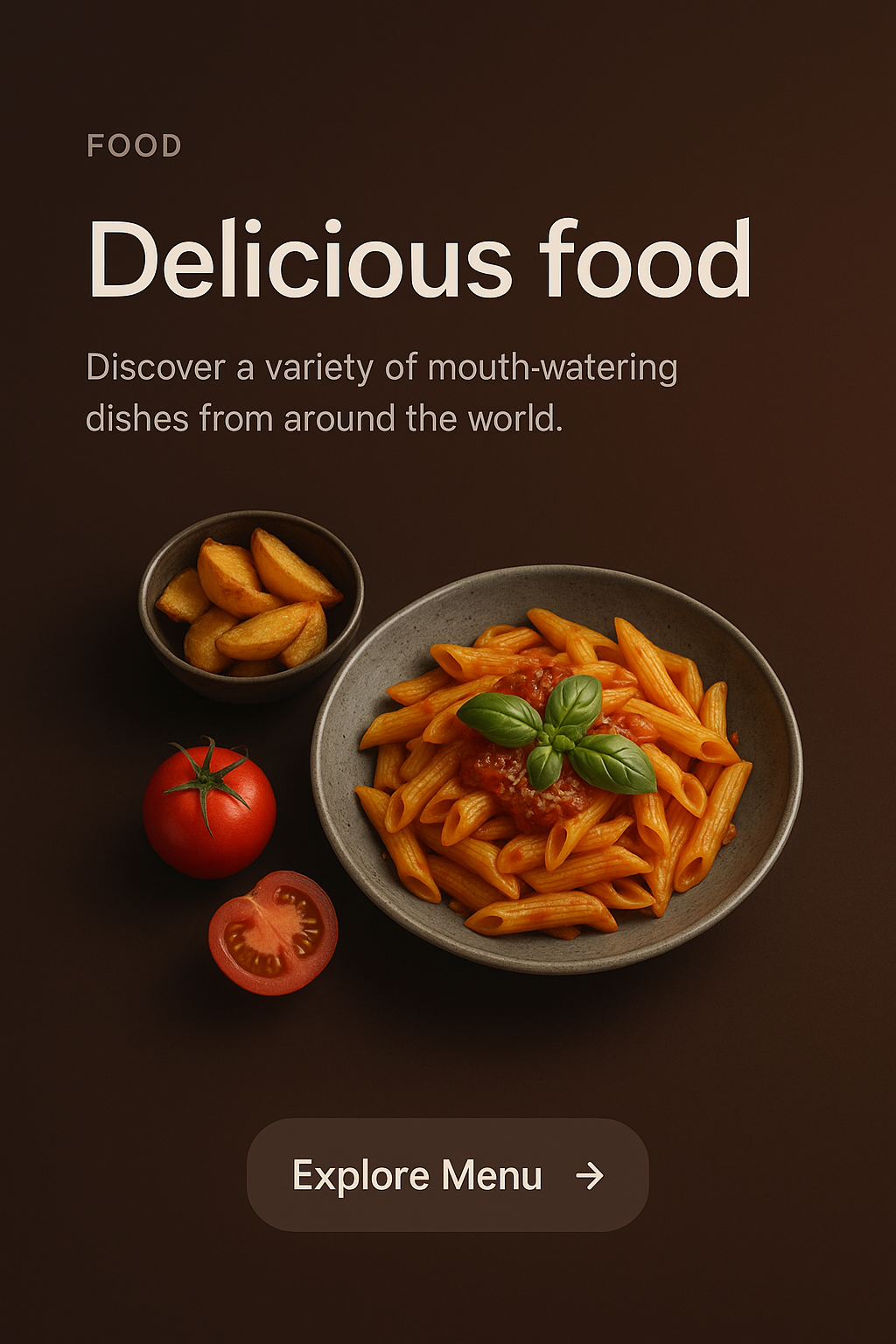 A sleek web page layout featuring a delicious pasta dish, accompanied by side dishes. The design incorporates a dark gradient background, enhancing the food's visual appeal.