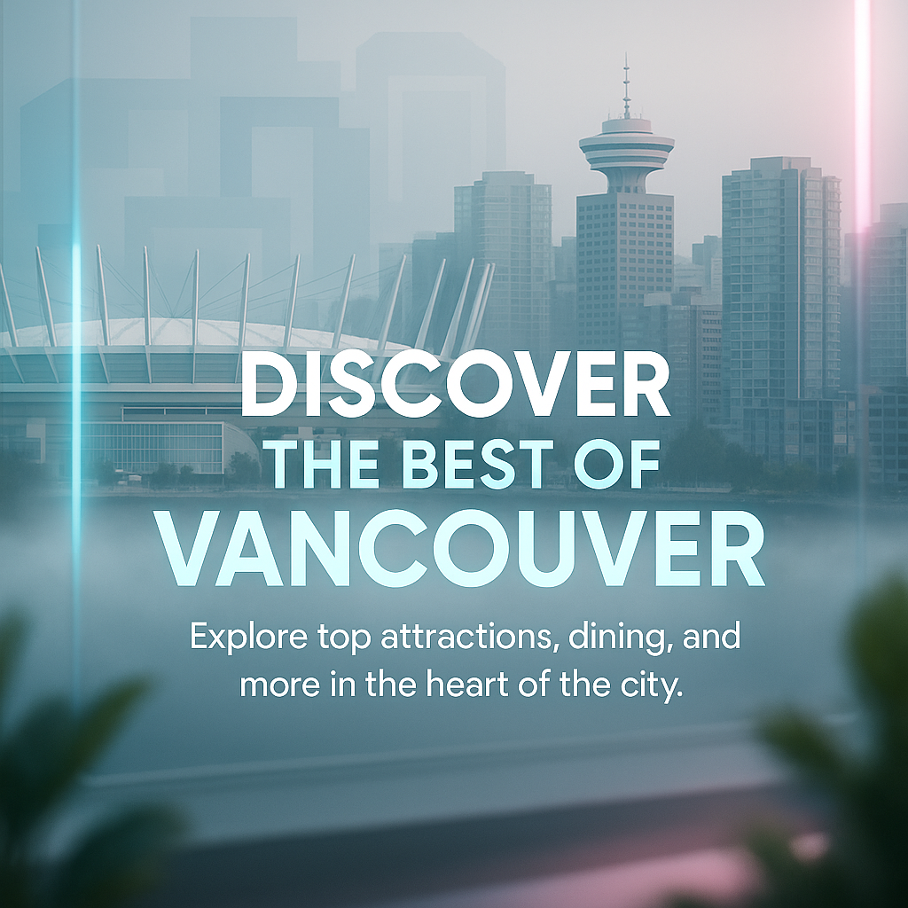 Stylish promotional image showcasing Vancouver's skyline with a focus on attractions and dining, ideal for tourism marketing and city exploration.