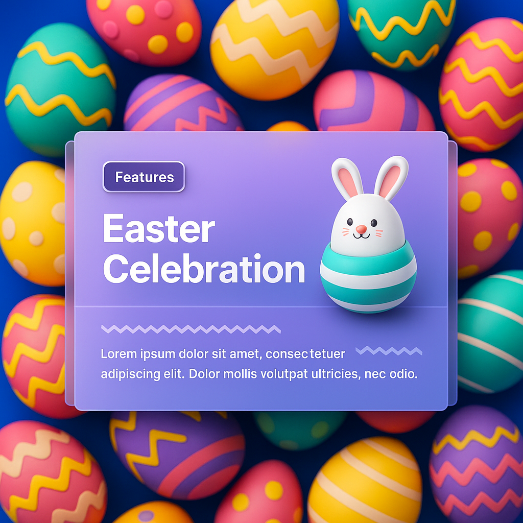 /Collection: /by davooda/Type: PNG/A vibrant collection of 3D Easter eggs in various colors, featuring a playful bunny illustration. The design integrates a feature block highlighting Easter celebrations.