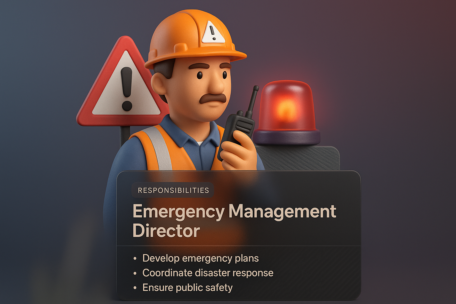 /Collection: /by davooda/Type: PNG/A 3D illustration featuring an Emergency Management Director with safety gear, a radio, and warning signs. The design includes a dark overlay for text highlighting key responsibilities.