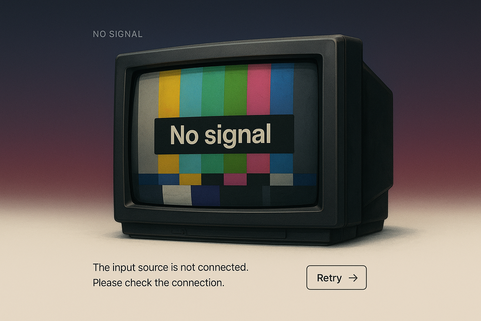 The image features a retro television displaying a 'No Signal' message with a colorful test pattern. It's designed with a dark gradient background and a prominent action button.
