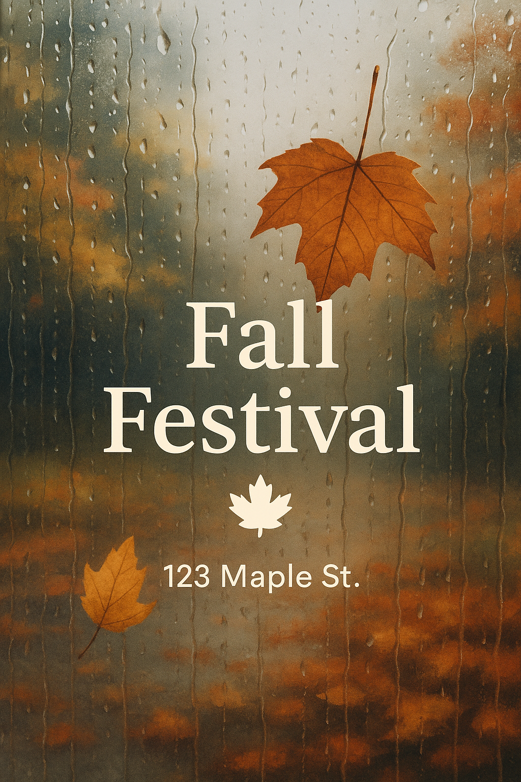 Charming event invitation graphic featuring fall leaves and a blurred background, ideal for promoting seasonal festivities and community gatherings.