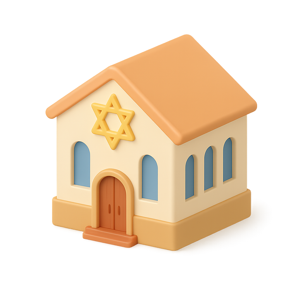 /Collection: /by davooda/Type: PNG/A stylized 3D icon of a synagogue prayer hall, featuring a star symbol, large windows, and a warm color palette. The design has a transparent background and a three-quarter view.
