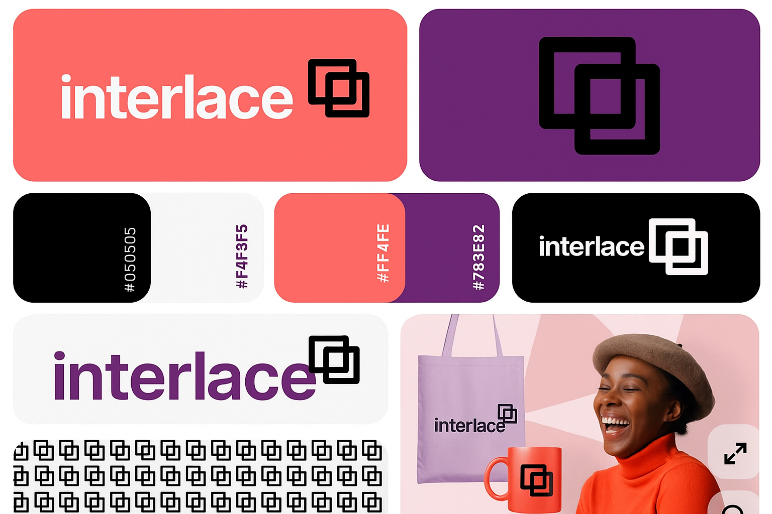 A vibrant showcase of brand redesign elements, featuring color palettes, logos, and graphics that reflect a fresh identity for 'interlace'.