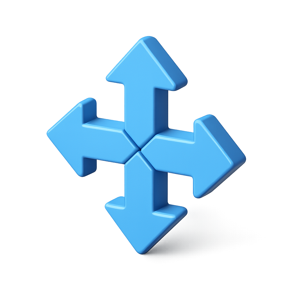 A visually striking 3D icon featuring directional arrows pointing in four different directions. The arrows have a glossy blue finish and a three-quarter isometric view, set against a soft gradient background.