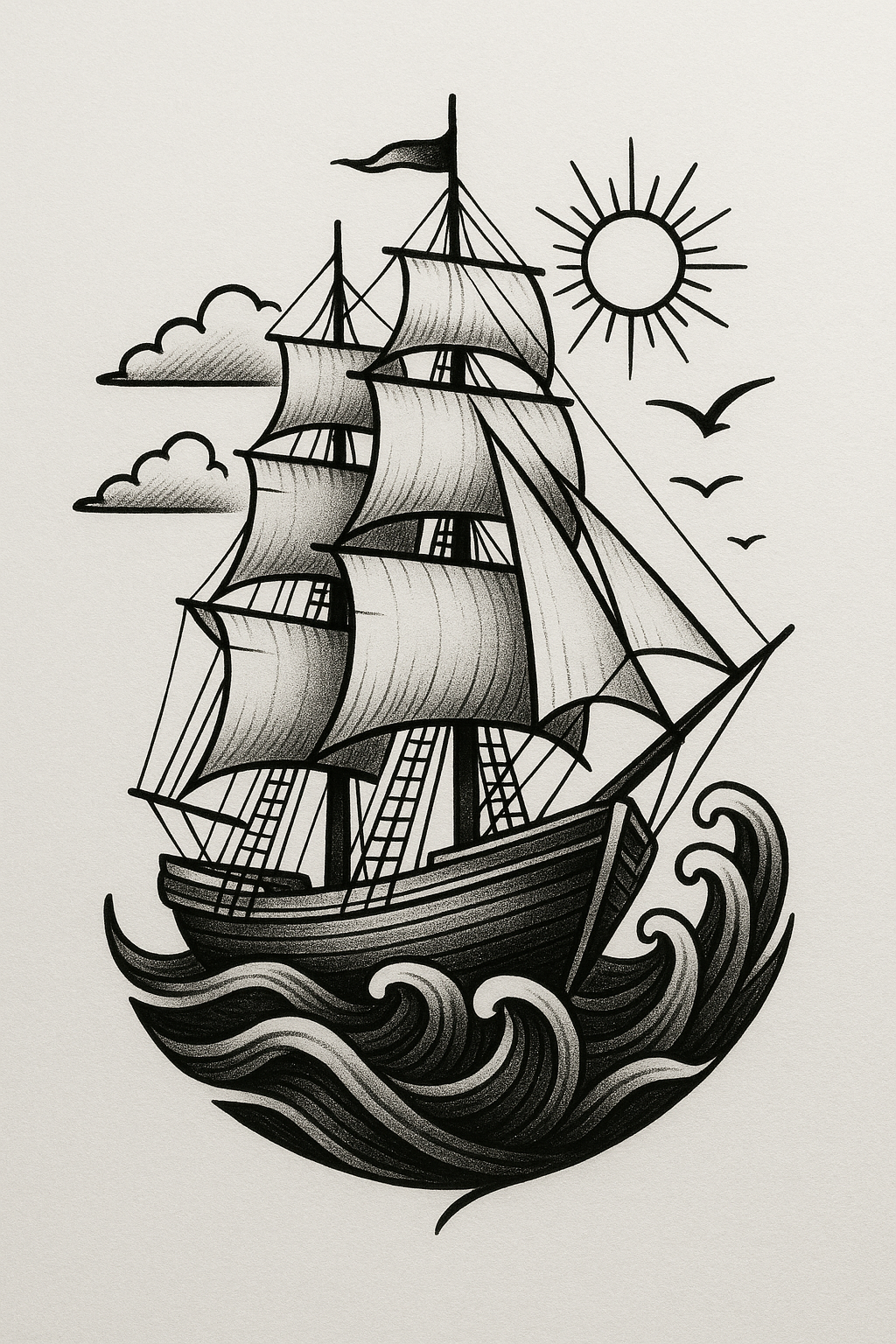 Black and White Tattoo Style Ship Illustration with Waves