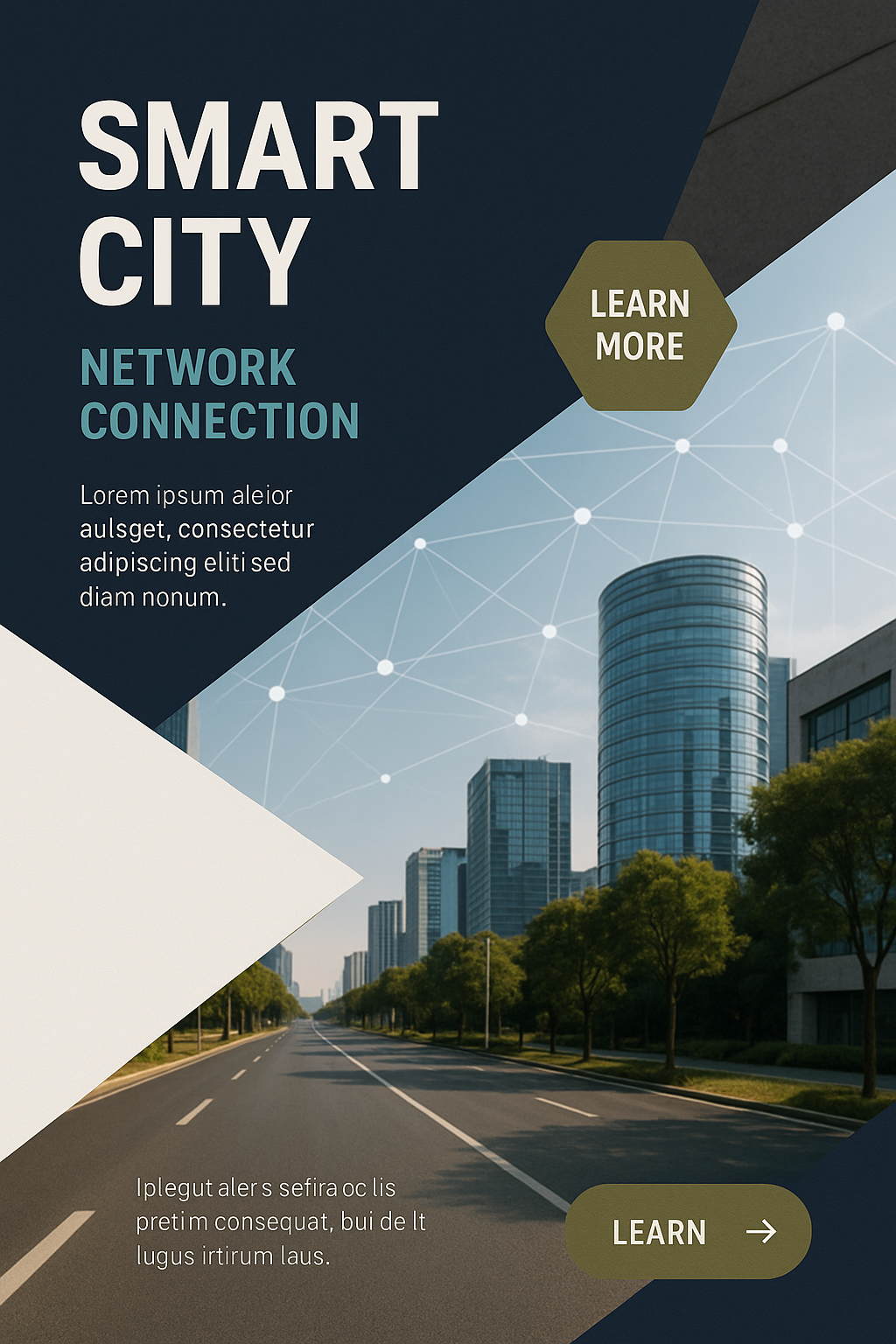 /Collection: /by davooda/Type: PNG/A visually striking representation of a smart city concept, featuring a modern urban setting with geometric elements and a clear call to action. The design incorporates a balanced composition and a professional aesthetic.