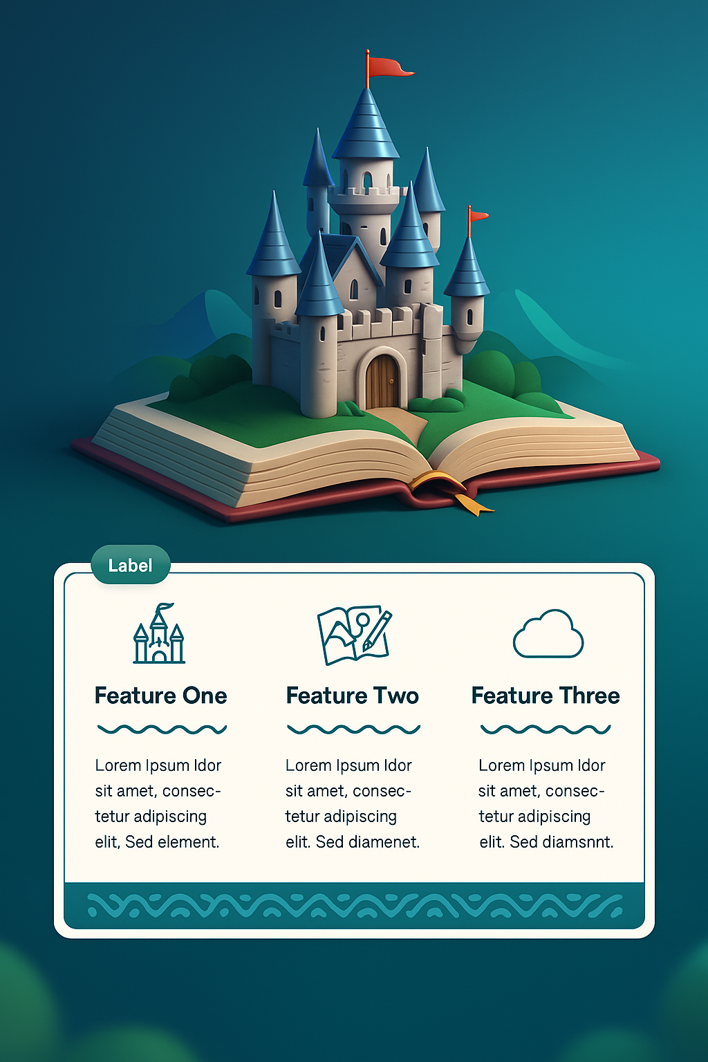 An enchanting 3D illustration of a castle rising from an open book, showcasing a vibrant fantasy world. The design includes a label and feature blocks, enhancing the magical theme.
