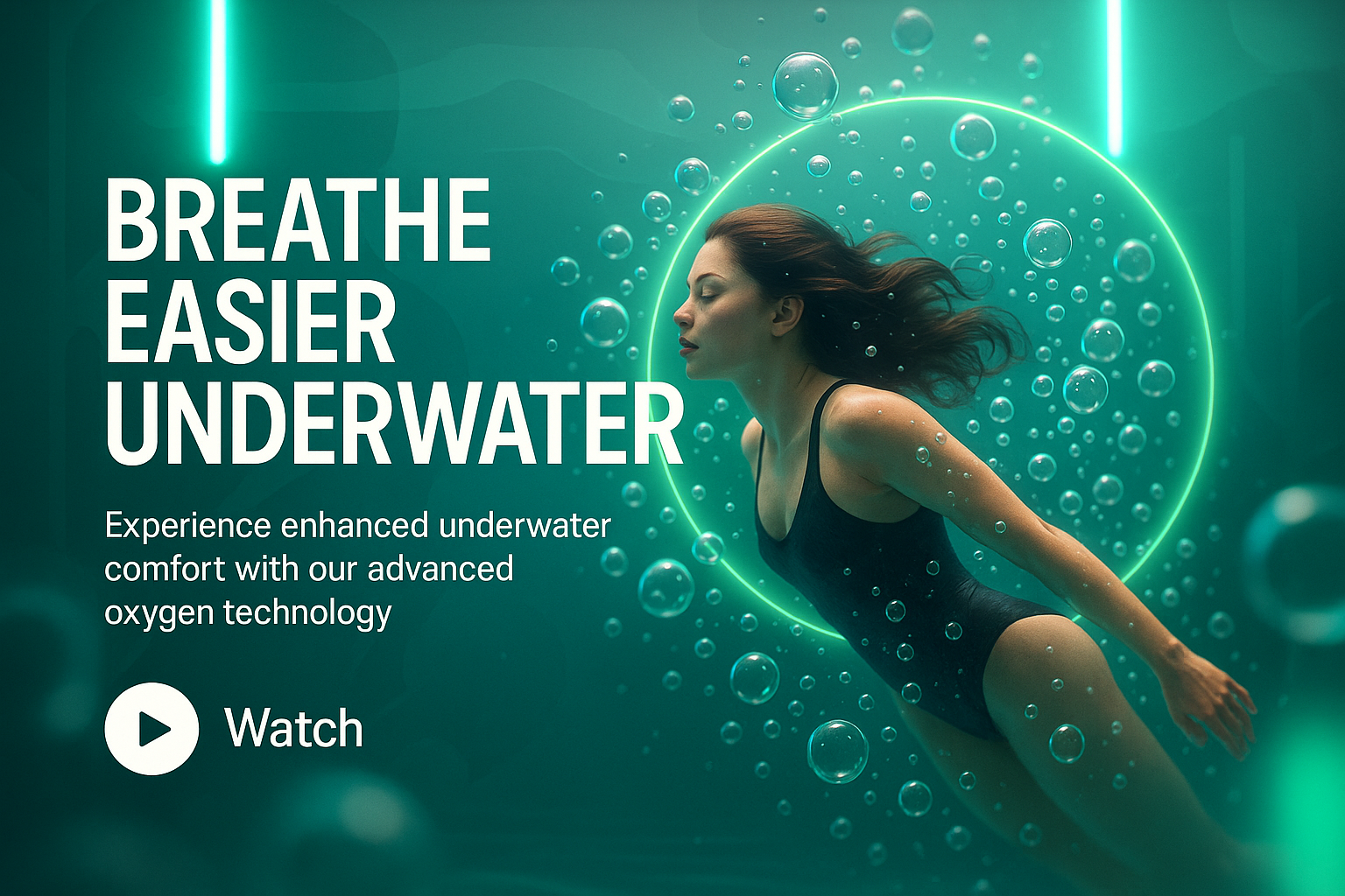 Engaging promotional graphic showcasing a swimmer in an underwater environment, highlighting advanced oxygen technology. The modern design appeals to a tech-savvy audience.