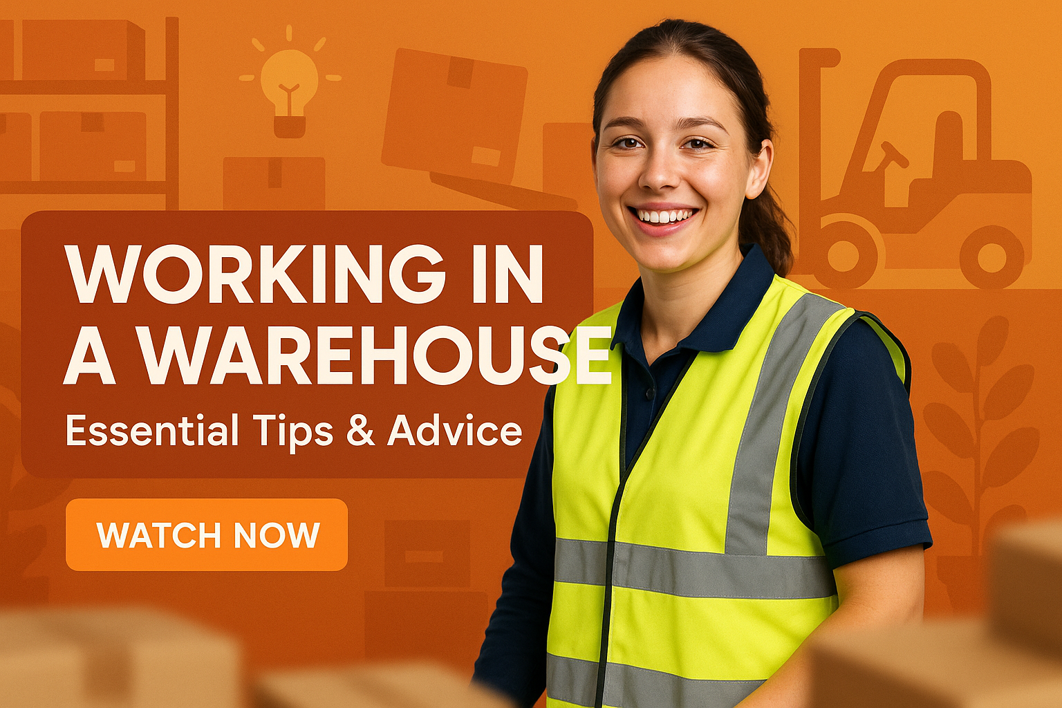 /Collection: /by davooda/Type: PNG/Engaging promotional image featuring a smiling worker in a safety vest, designed to provide essential tips and advice for working in a warehouse. Suitable for online educational content.