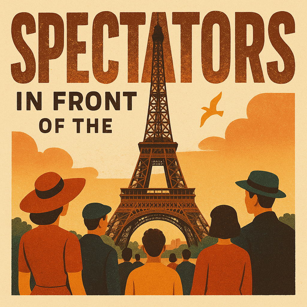 /Collection: /by davooda/Type: PNG/A vibrant illustrated graphic depicting spectators in front of the Eiffel Tower, combining retro design elements with a warm color palette, suitable for travel-related content.