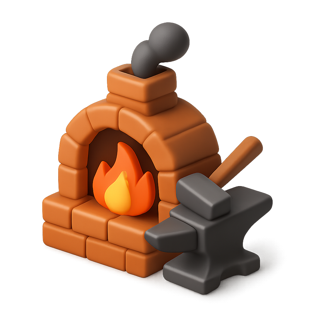 A vibrant 3D illustration of a blacksmith forge featuring a brick structure with flames, smoke, and an anvil, showcasing the craft of metalworking.