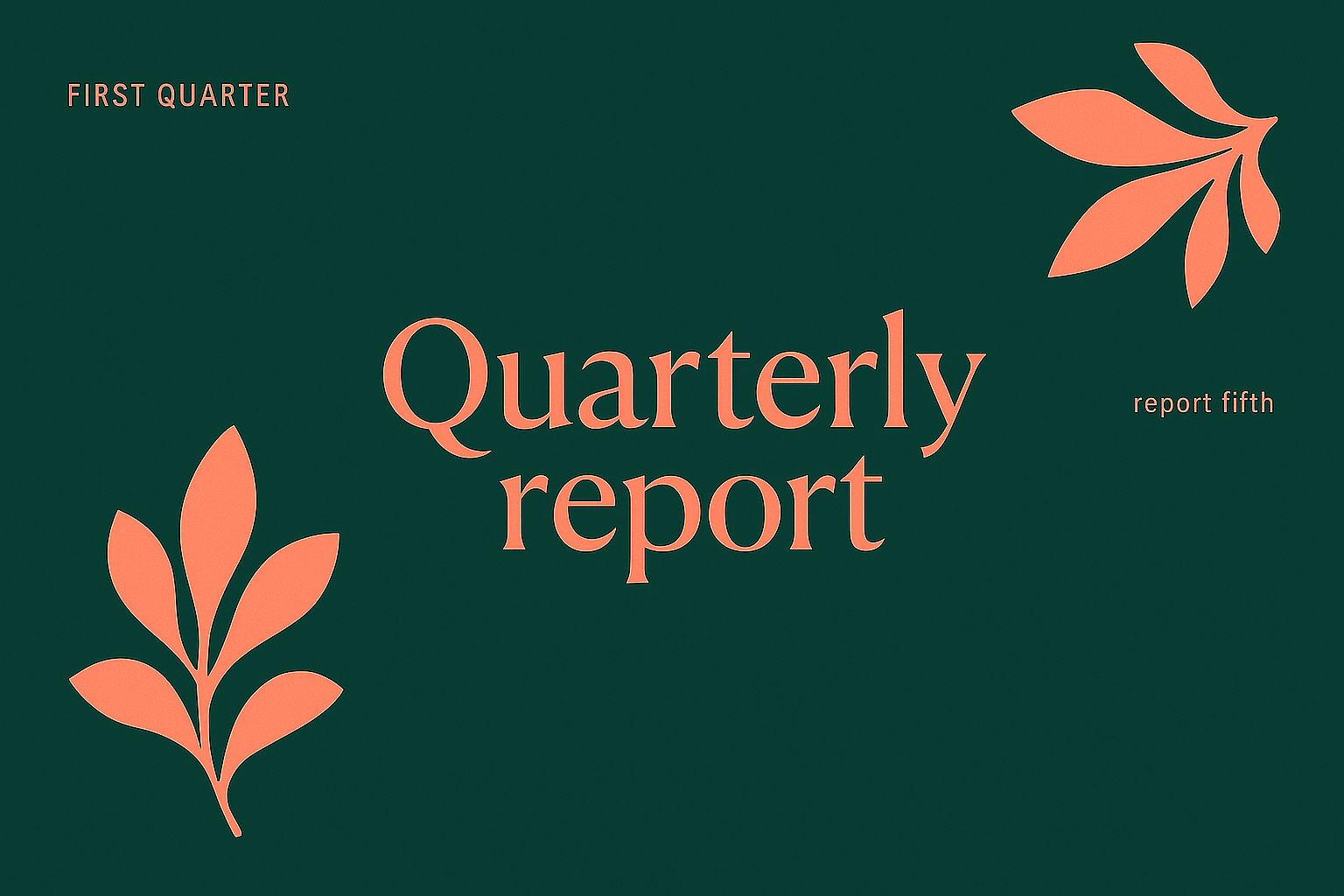 An elegant quarterly report design featuring a dark green background, soft peach floral elements, and modern typography emphasizing 'Quarterly Report' and 'First Quarter'.