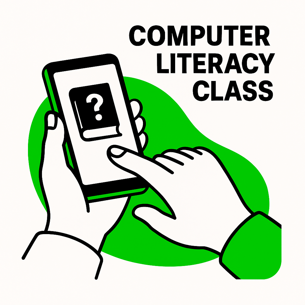 /Collection: /by davooda/Type: PNG/Digital illustration showcasing a hand interacting with a mobile device displaying a book icon, symbolizing computer literacy education. The design features playful colors and simple shapes, ideal for educational campaigns.