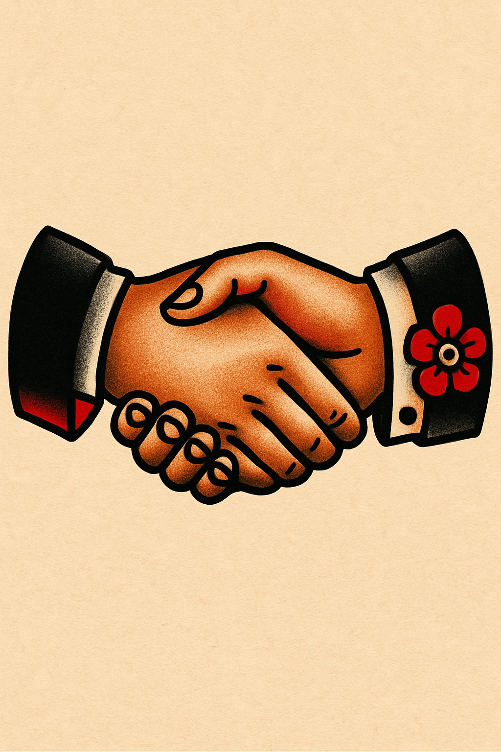 /Collection: /by davooda/Type: PNG/This graphic features a stylized handshake with a vintage aesthetic, suitable for themes of agreement and partnership. It combines bold colors and decorative elements.