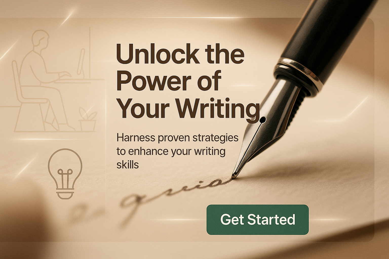 Engaging promotional image featuring a fountain pen and soft background, aimed at encouraging individuals to improve their writing abilities.