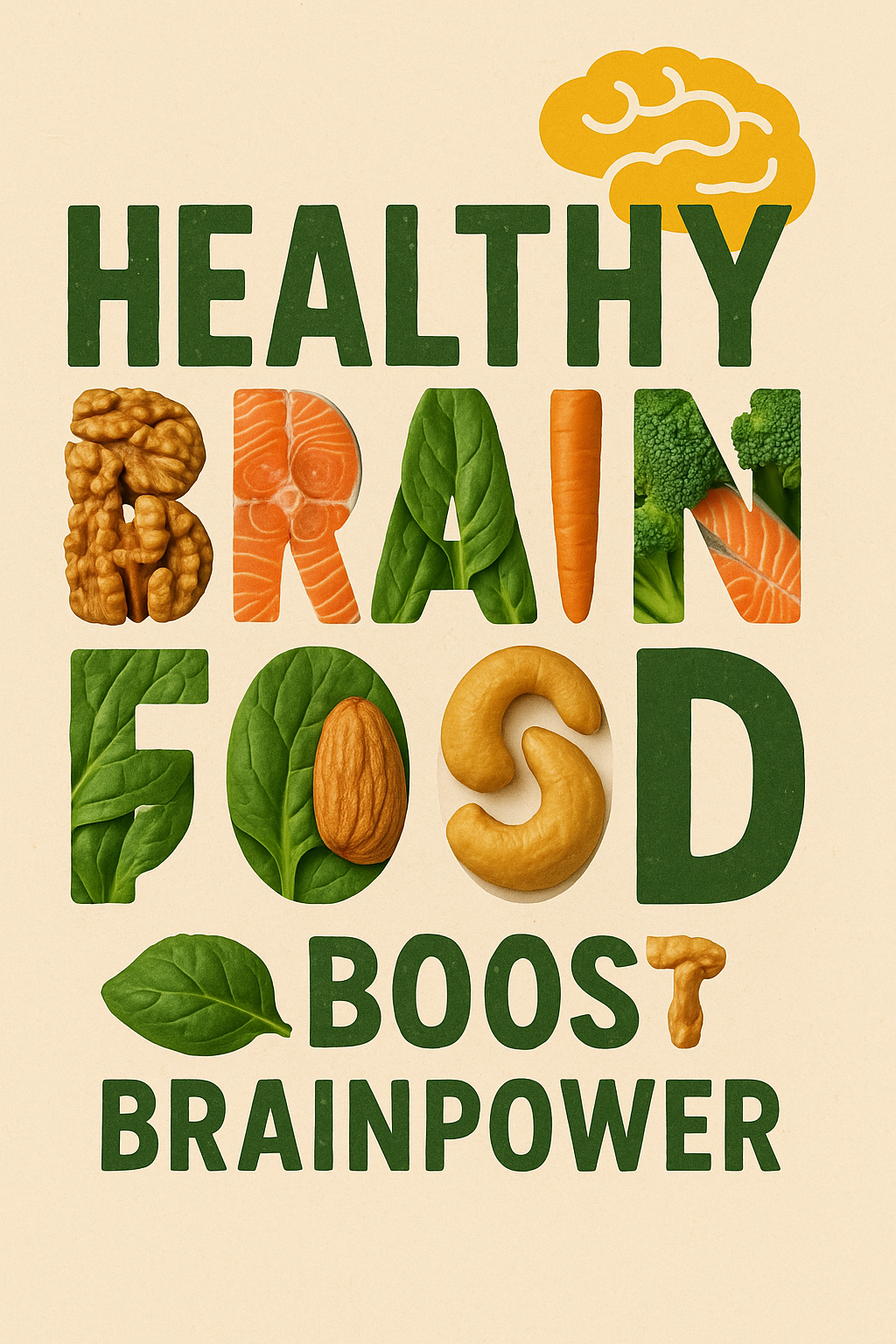 Colorful illustration emphasizing the importance of nutritious foods for brain health, featuring various food items creatively integrated into the typography. Ideal for health and wellness campaigns.