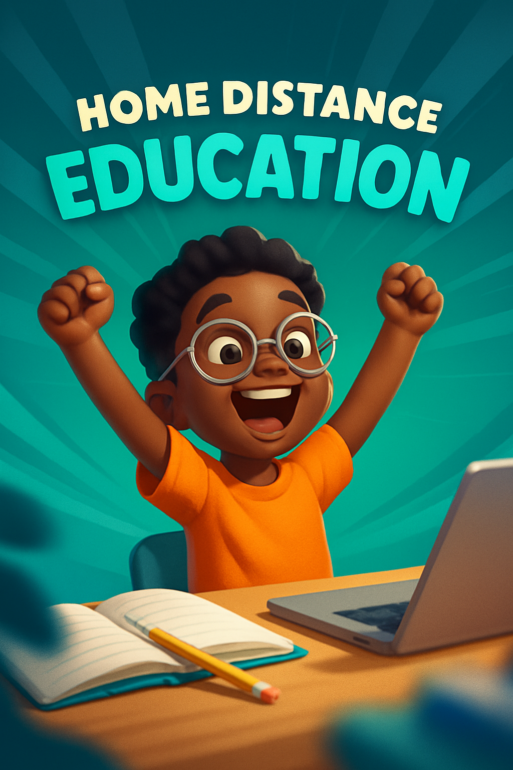 /Collection: /by davooda/Type: PNG/A young African American boy joyfully raises his hands during a home learning session, surrounded by books and a laptop. The vibrant background features dynamic rays of color, enhancing the excitement of distance education.