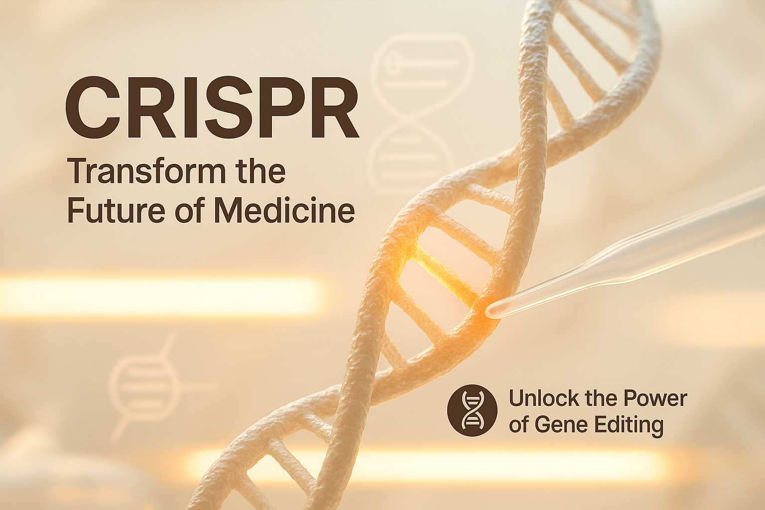 Informative promotional graphic showcasing CRISPR technology with a focus on its transformative potential in medicine. Features a stylized DNA strand and a pipette in a modern design.
