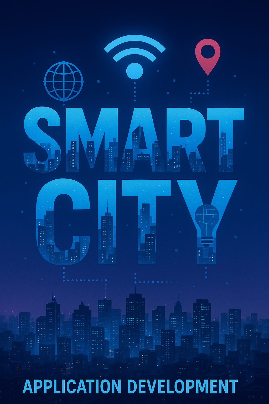 Stylized graphic representation for smart city application development, featuring urban skyline and technology icons, suitable for tech-related marketing.