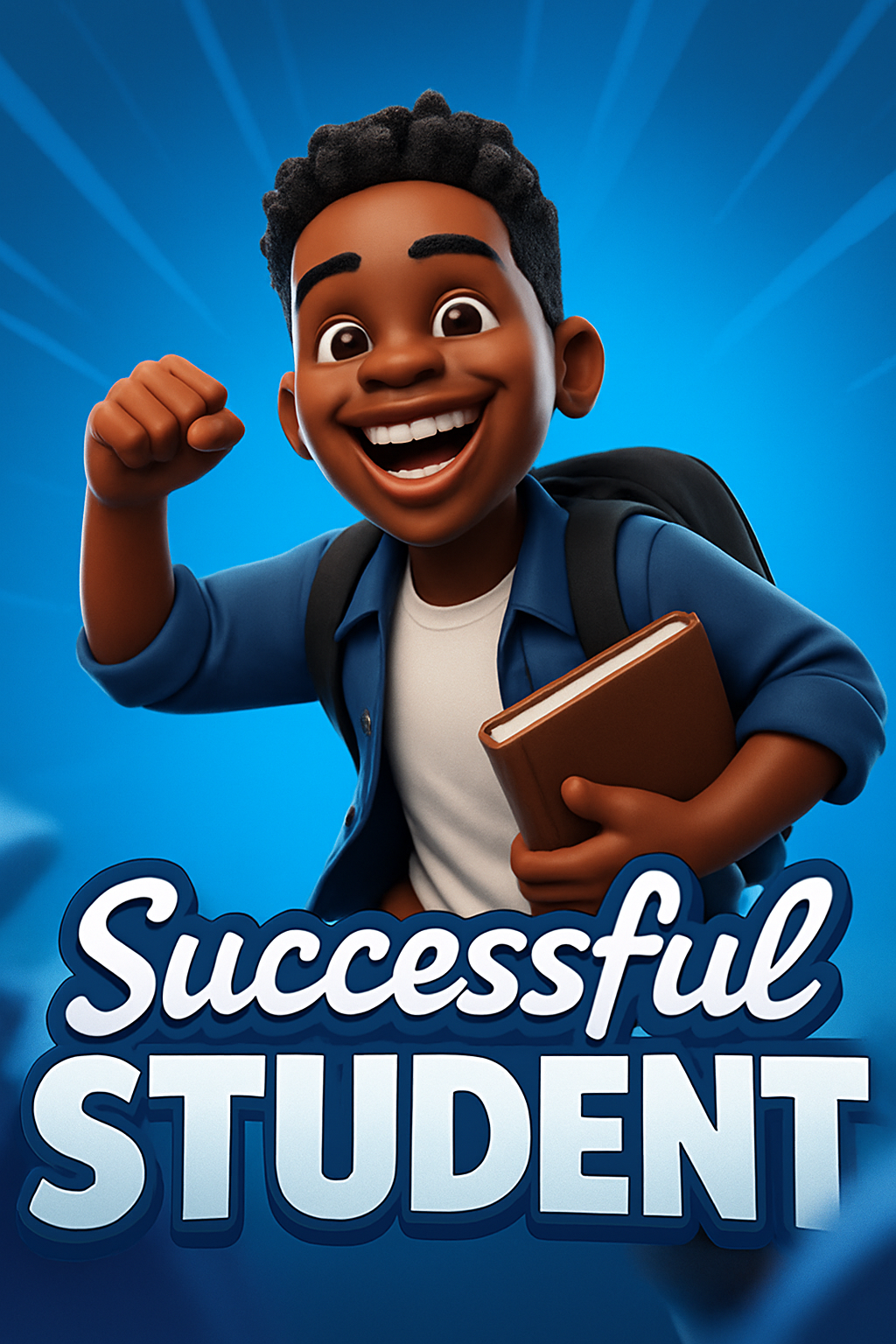 /Collection: /by davooda/Type: PNG/A vibrant 3D illustration of a cheerful black student, celebrating success with a joyful smile. The background features a smooth gradient, enhancing the dynamic energy of the scene.