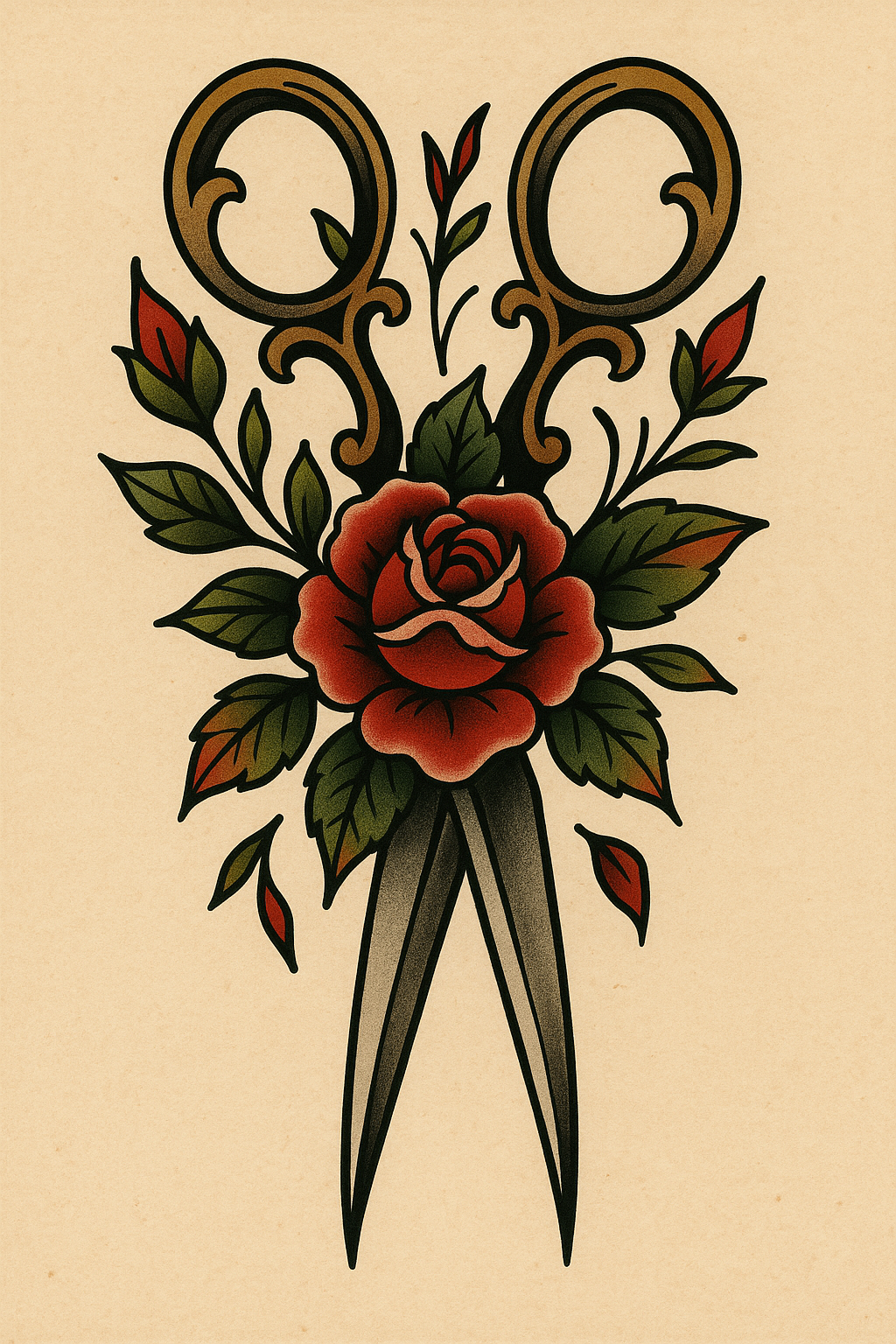 This image features a tattoo design combining ornate scissors and a vibrant rose, emphasizing floral and vintage aesthetics. Ideal for tattoo lovers and artists.