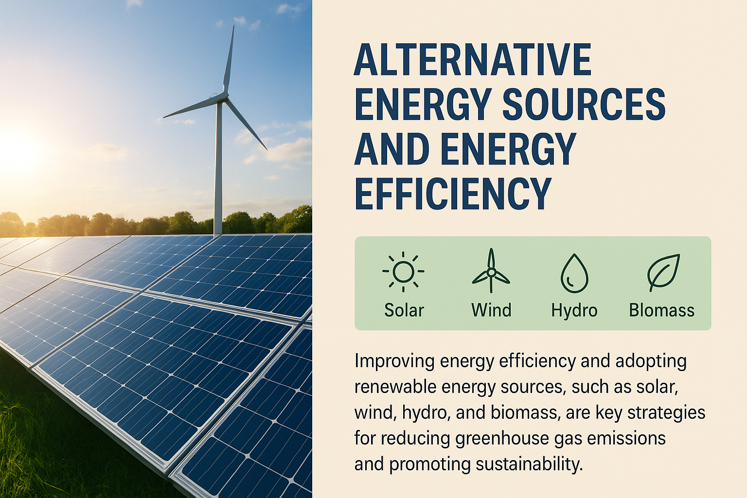 Informative graphic showcasing various renewable energy sources, including solar, wind, hydro, and biomass, emphasizing energy efficiency. Ideal for educational content.