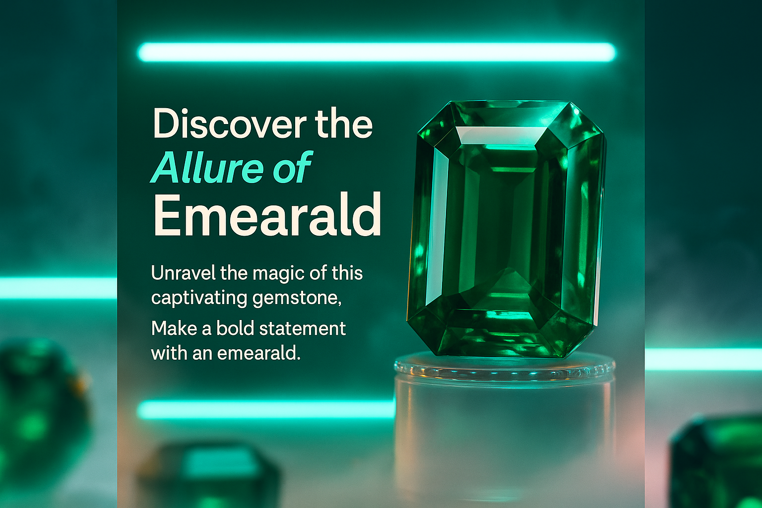 A visually striking LinkedIn carousel slide featuring an emerald gemstone with neon accents and a captivating text block that highlights its allure.